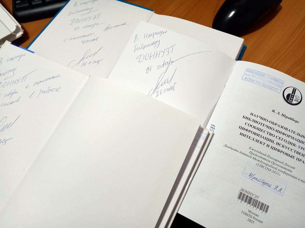 Коллектив Научной библиотеки выражает благодарность Якову Леонидовичу Шрайбергу, научному руководителю ГПНТБ России, заведующему кафедрой цифровой трансформации библиотек МГЛУ, доктору технических наук, профессору, член-корреспонденту РАО, заслуженному деятелю науки РФ, за предоставленную возможность принять участие в работе 29-й Международной Конференции и выставки «LIBCOM-2025» (24-28.11.2025, г. Суздаль) и полученные в дар Научной библиотеке издания.