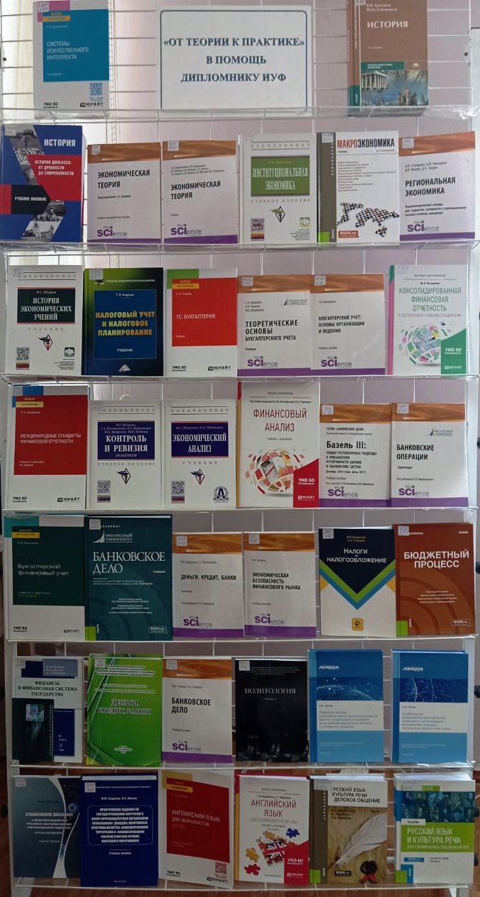 Цель выставки ‒ помочь студенту правильно подобрать литературу по теме выпускной работы, оформить ее в соответствии с требованиями стандартов. На выставке экспонируются учебники и учебные пособия по всем основным изучаемым дисциплинам института учета и финансов по направлениям подготовки: банковское дело, финансы, бухгалтерский учет и аудит.