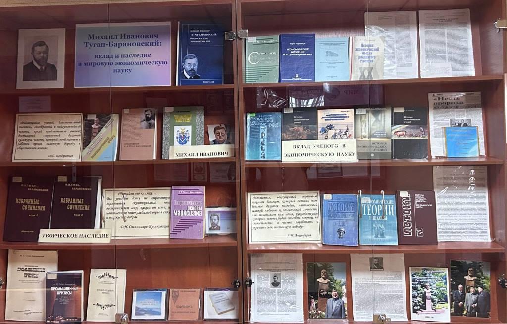 На книжной выставке представлены самые известные научные труды М.И. Туган-Барановского: «Промышленные кризисы: очерк из социальной истории Англии», «Социальные основы кооперации», «Периодические промышленные кризисы. История английских кризисов. Общая теория кризисов» (репринт-издание 1923 года, изданное в Смоленске»), Бумажные деньги и металл», (посмертное издание с изменениями автора 1919 г.), «К лучшему будущему».
